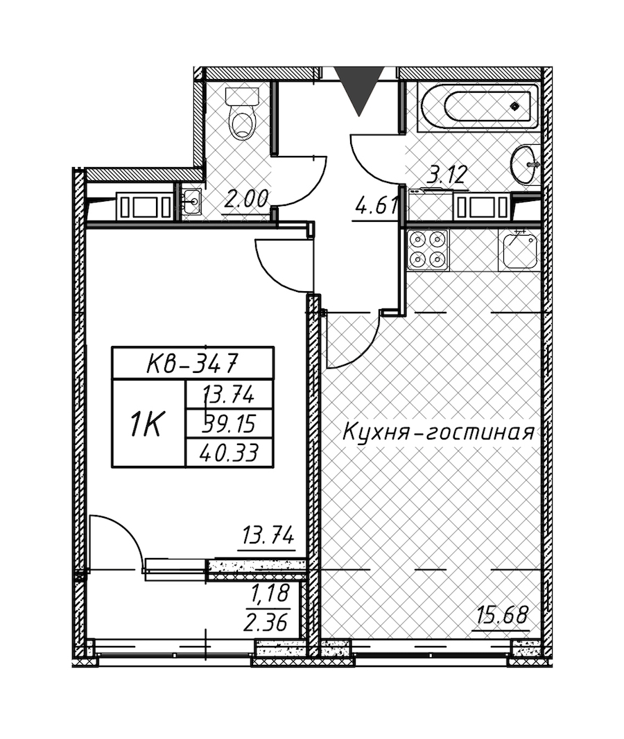 Однокомнатная квартира на 10-ом этаже 40,33 кв.м