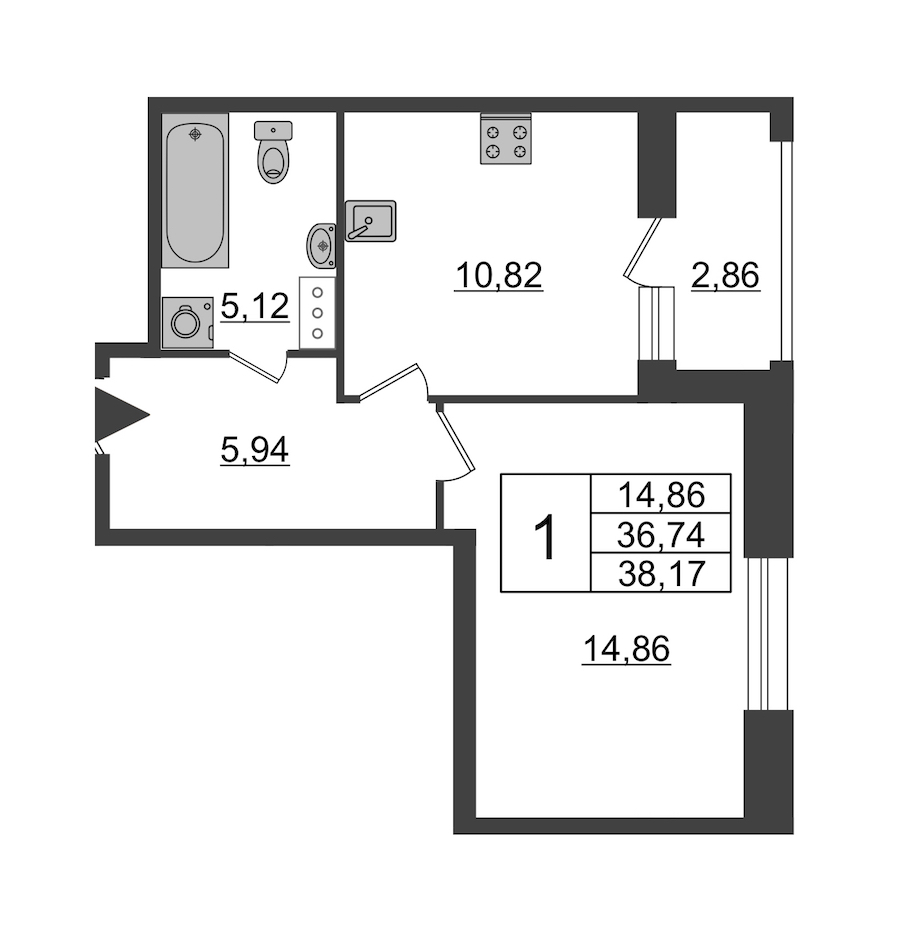 Однокомнатная квартира на 12-ом этаже 39,3 кв.м