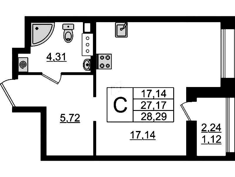Квартира-студия на 12-ом этаже 28,29 кв.м