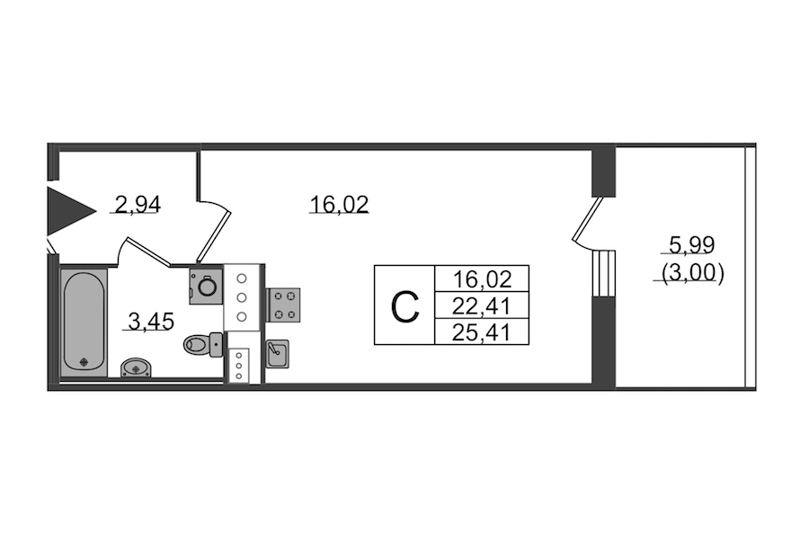 Квартира-студия на 12-ом этаже 25,41 кв.м