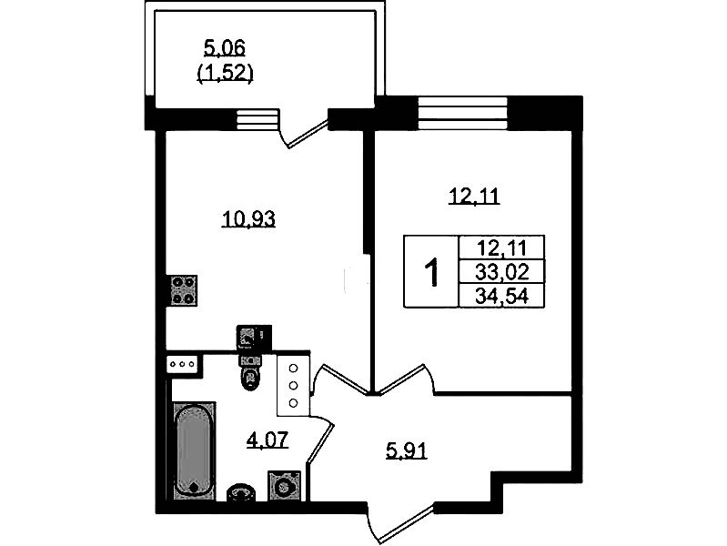 Однокомнатная квартира на 11-ом этаже 34,2 кв.м
