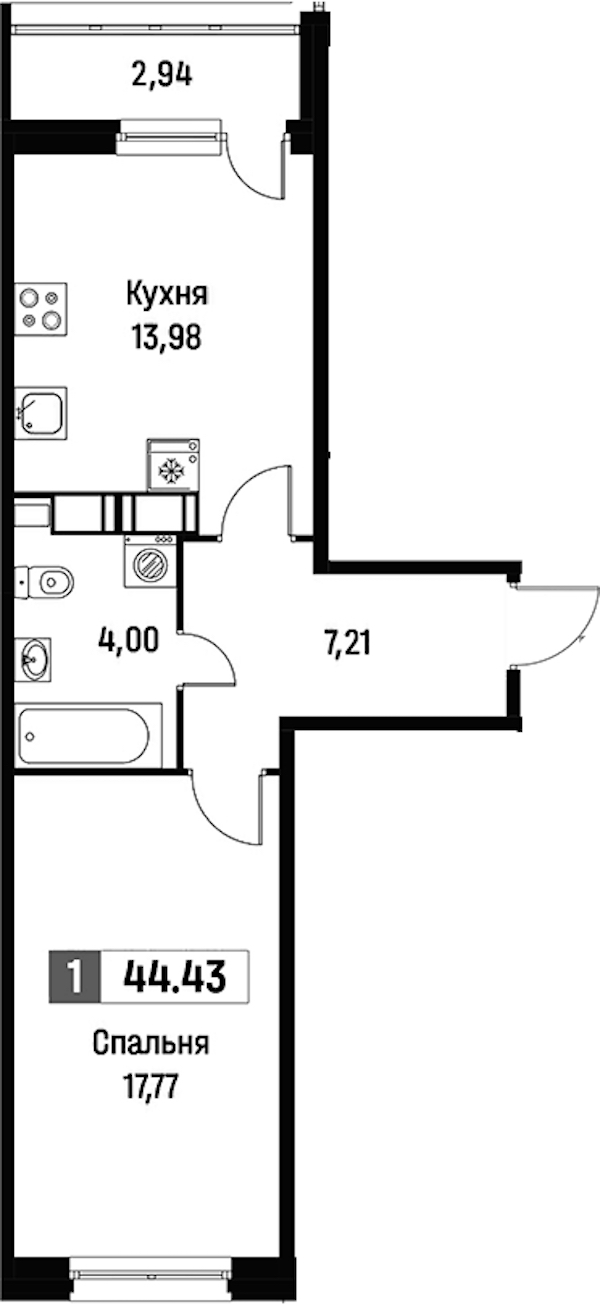 Однокомнатная квартира на 2-ом этаже 44,43 кв.м