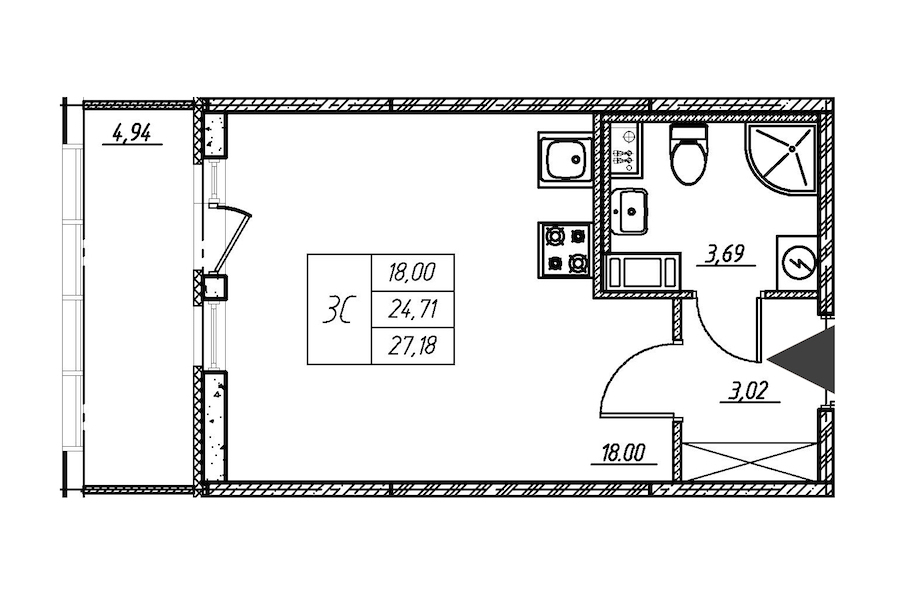 Квартира-студия на 15-ом этаже 24,4 кв.м