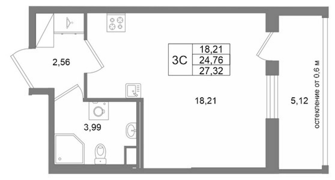 Квартира-студия на 16-ом этаже 24,76 кв.м