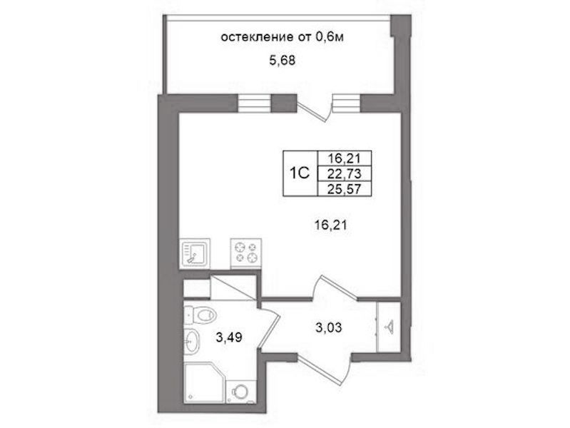 Квартира-студия на 12-ом этаже 22,73 кв.м