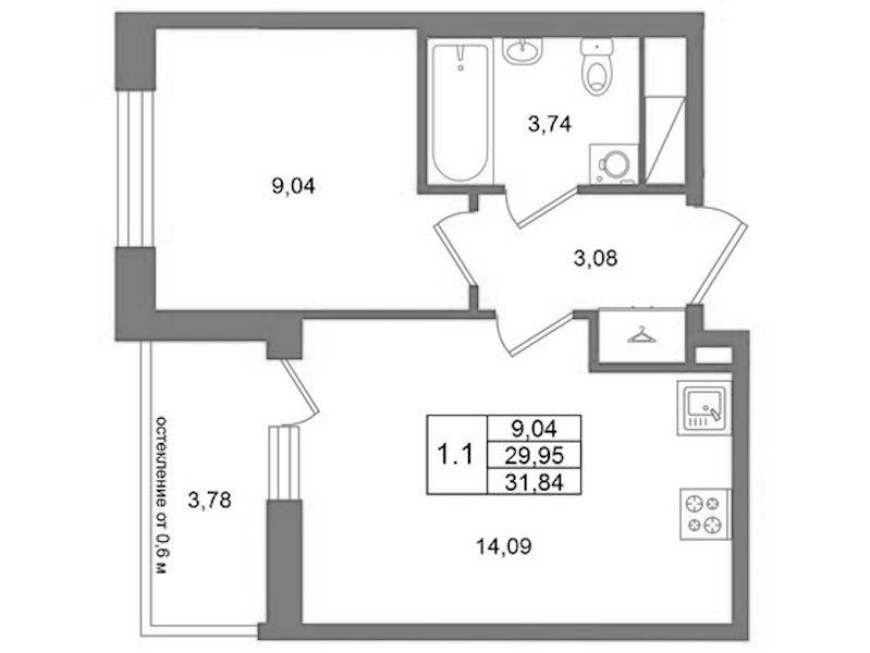Однокомнатная квартира на 4-ом этаже 29,95 кв.м