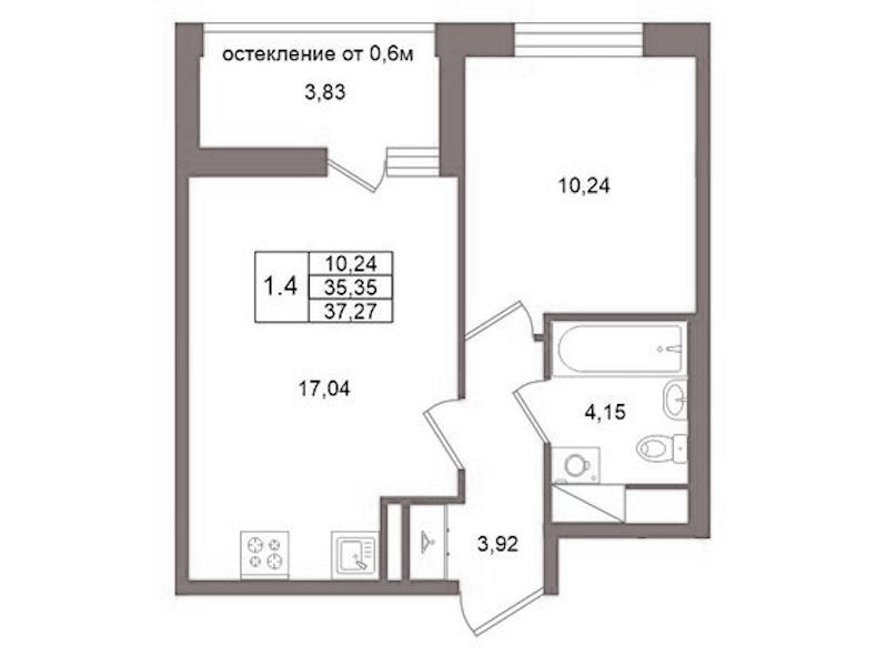 Однокомнатная квартира на 9-ом этаже 35,35 кв.м