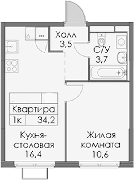 Однокомнатная квартира на 15-ом этаже 34,2 кв.м