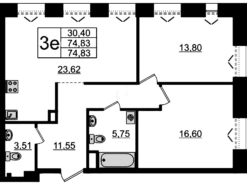 Двухкомнатная квартира на 5-ом этаже 74,83 кв.м