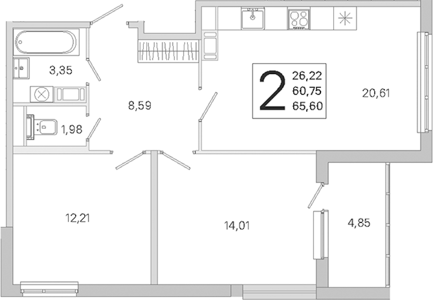Двухкомнатная квартира на 3-ем этаже 60,75 кв.м