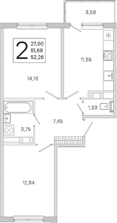 Двухкомнатная квартира на 5-ом этаже 51,68 кв.м