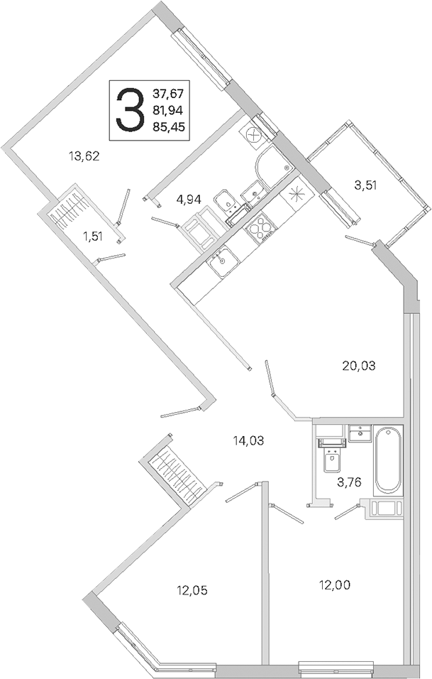 Трёхкомнатная квартира на 5-ом этаже 81,94 кв.м