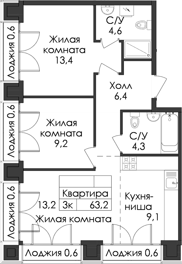 Двухкомнатная квартира на 8-ом этаже 63,2 кв.м