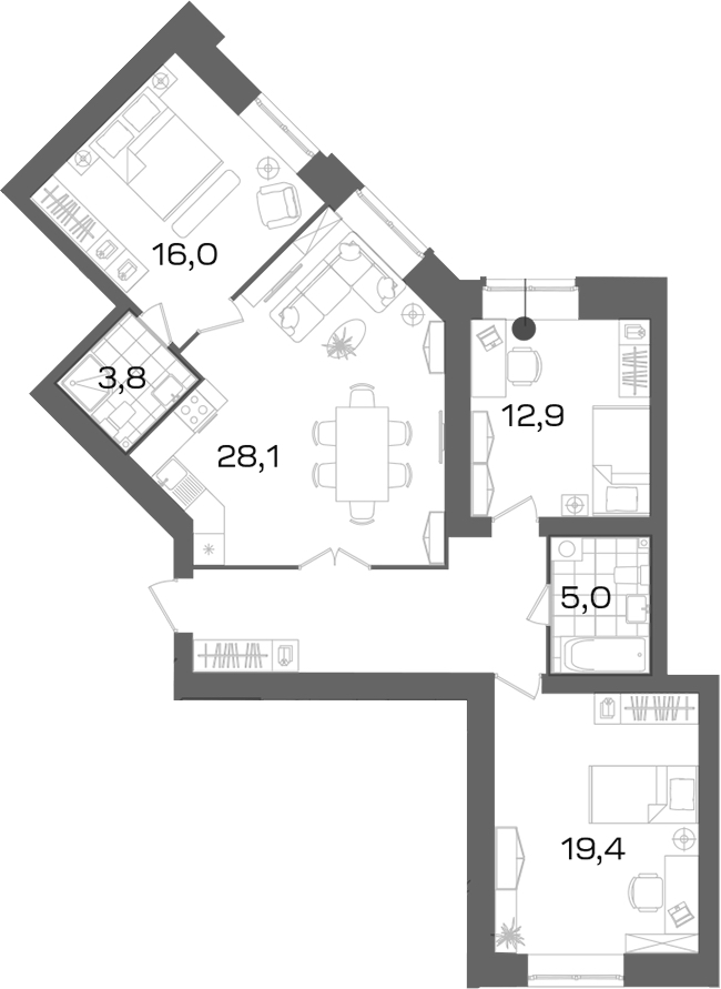 - Площадь кухни28,1 м2