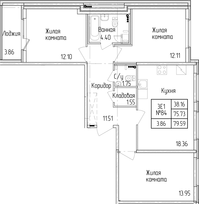 - Площадь75,73 м2