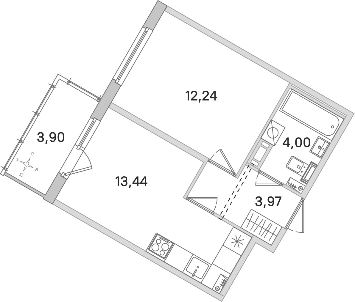 - Площадь кухни13,44 м2
