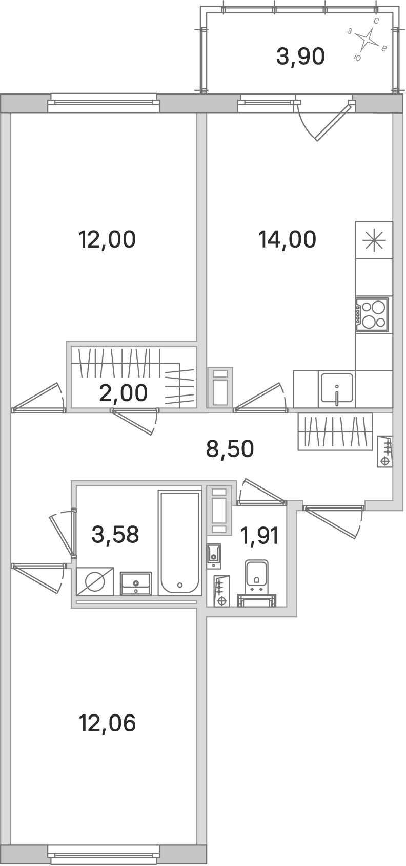 Двухкомнатная квартира на 4-ом этаже 54,05 кв.м