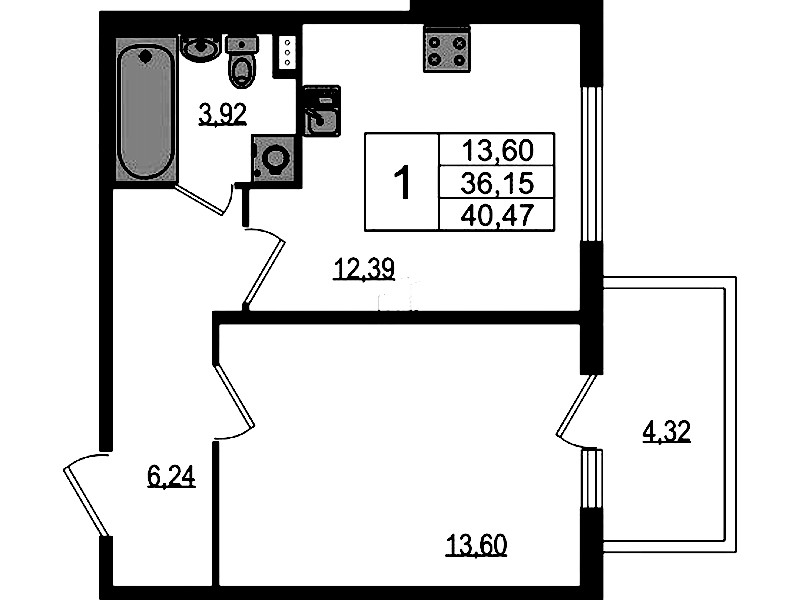 Однокомнатная квартира на 1-ом этаже 36,15 кв.м