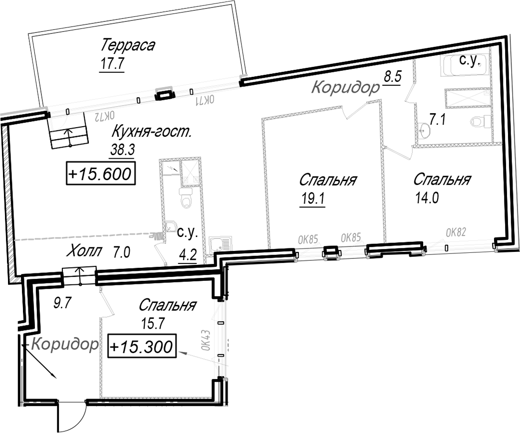 - Площадь кухни38,3 м2