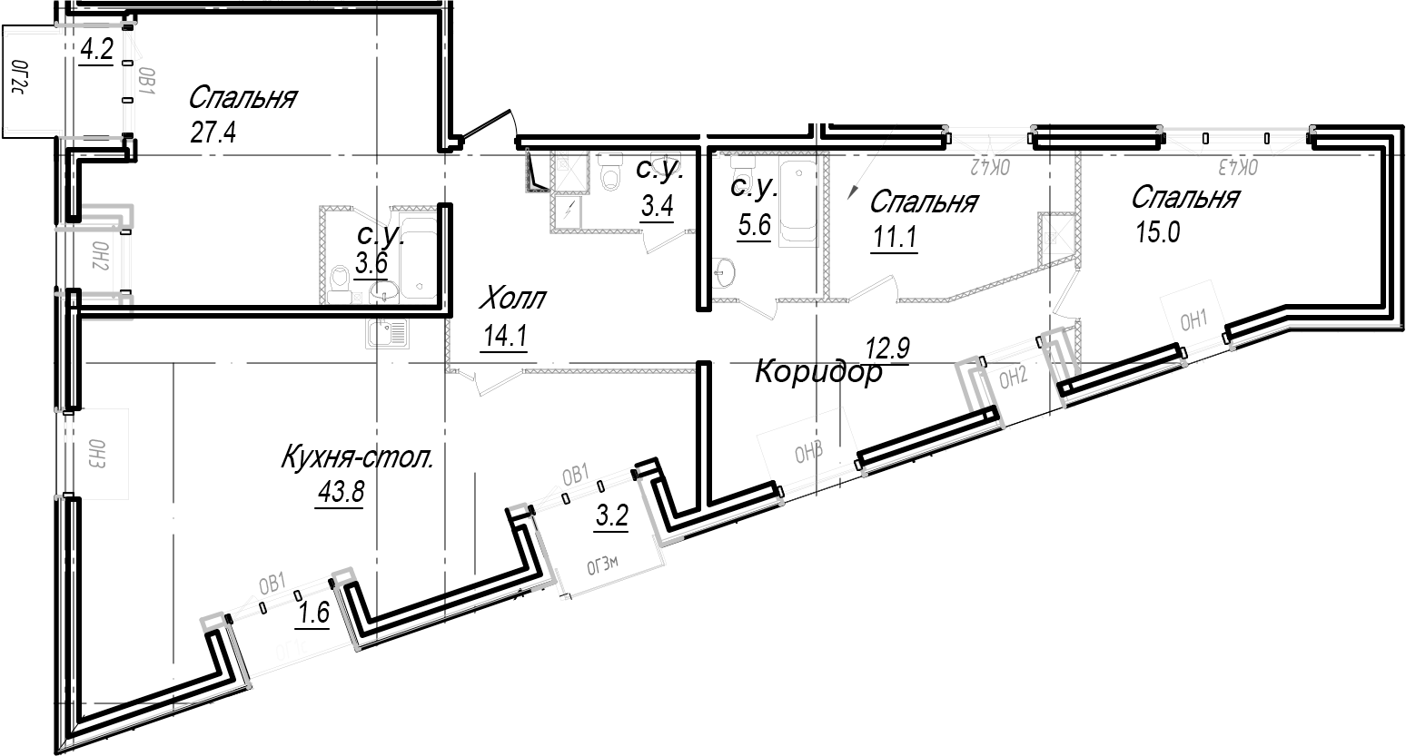- Площадь кухни43,8 м2