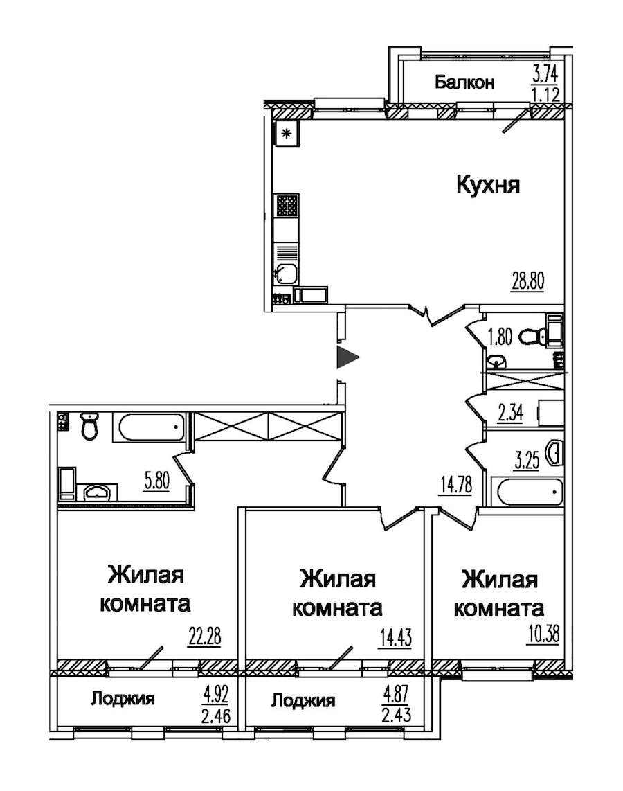 - Площадь кухни28,8 м2