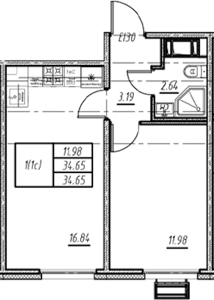 Однокомнатная квартира на 9-ом этаже 34,65 кв.м