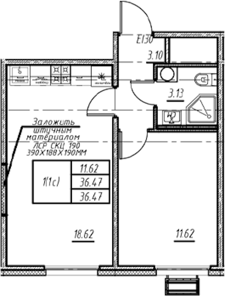 Однокомнатная квартира на 19-ом этаже 36,47 кв.м