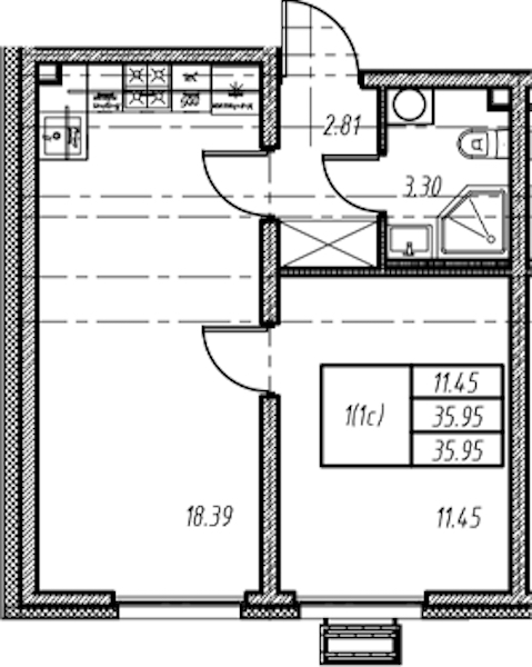 Однокомнатная квартира на 2-ом этаже 35,95 кв.м