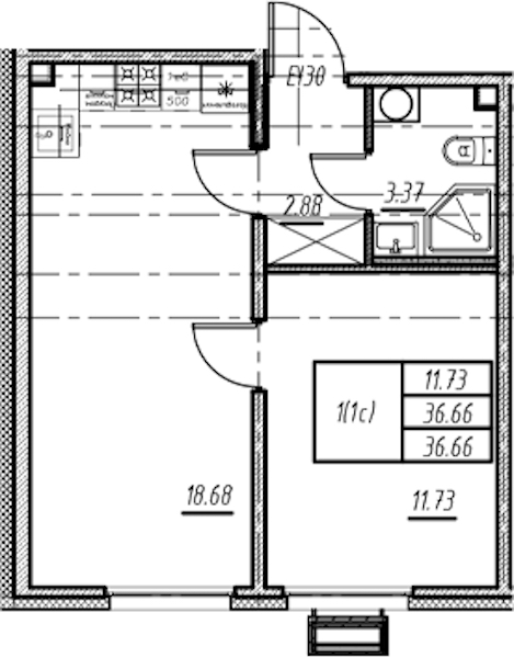 Однокомнатная квартира на 14-ом этаже 36,66 кв.м