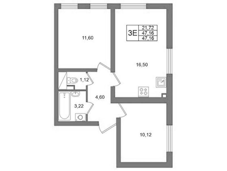 Двухкомнатная квартира на 11-ом этаже 47,16 кв.м
