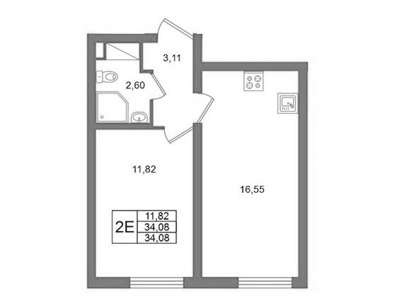 Однокомнатная квартира на 6-ом этаже 34,08 кв.м
