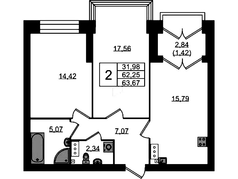 Двухкомнатная квартира на 13-ом этаже 63,67 кв.м