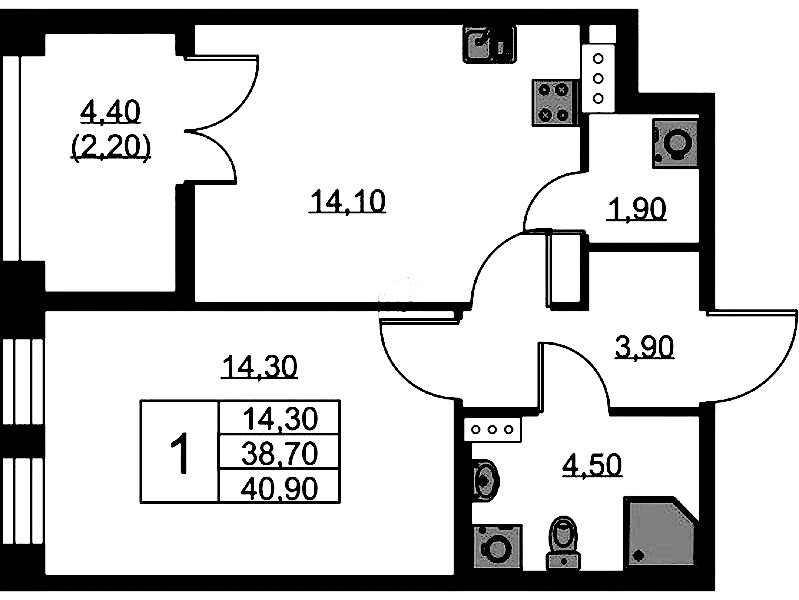 - Площадь40,9 м2