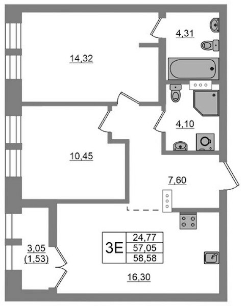 - Площадь58,58 м2