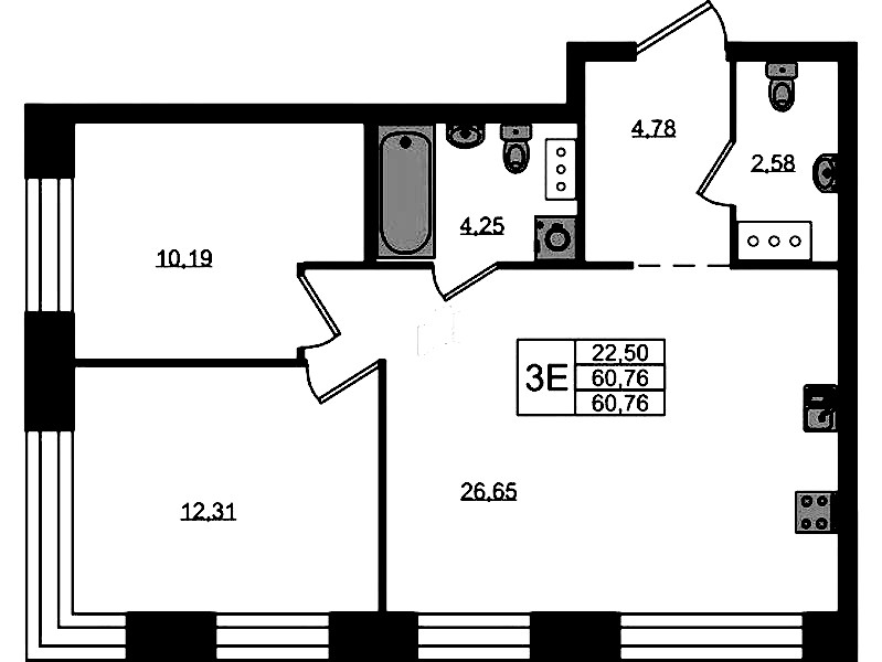 Двухкомнатная квартира на 3-ем этаже 60,76 кв.м