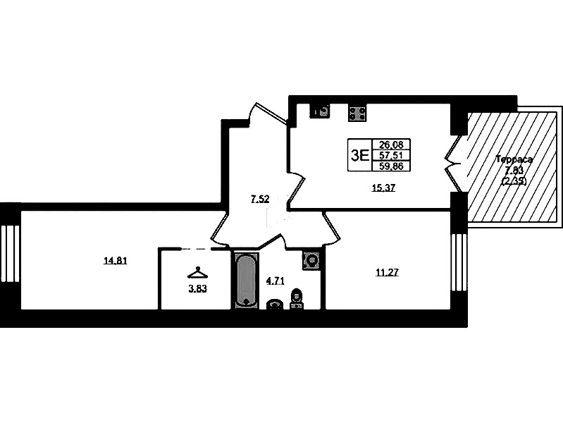 Двухкомнатная квартира на 2-ом этаже 59,86 кв.м