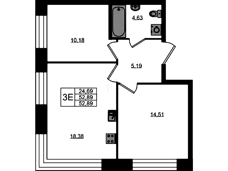 Двухкомнатная квартира на 2-ом этаже 52,89 кв.м