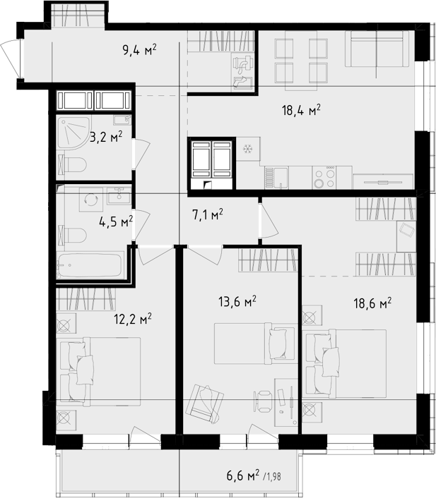 - Площадь кухни18,4 м2