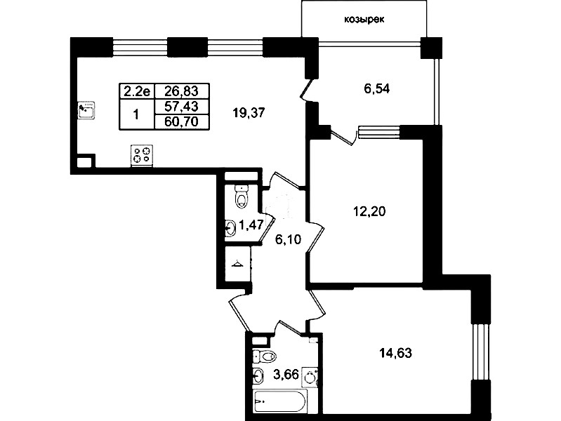 - Площадь57,43 м2