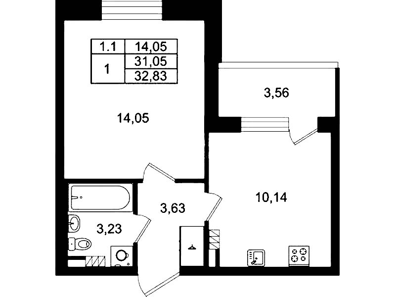 Однокомнатная квартира на 5-ом этаже 31,05 кв.м