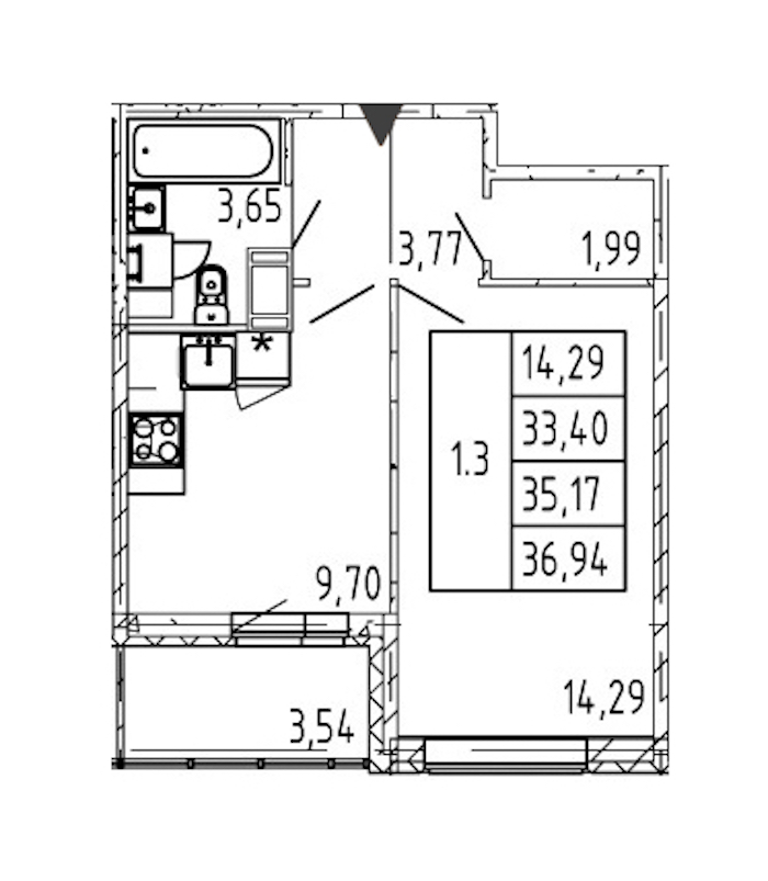 - Площадь33,4 м2