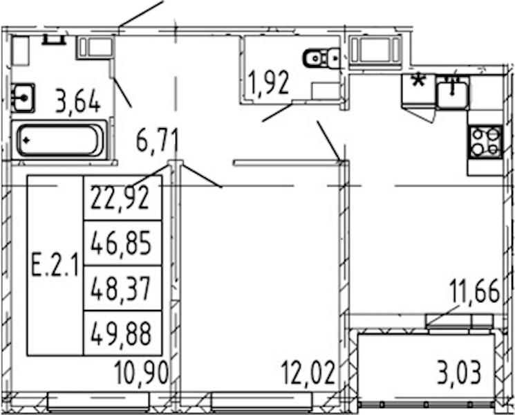 Двухкомнатная квартира на 11-ом этаже 46,85 кв.м