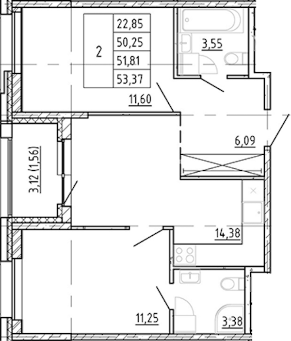 Двухкомнатная квартира на 2-ом этаже 50,25 кв.м