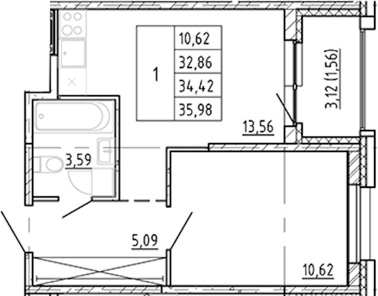 Однокомнатная квартира на 9-ом этаже 32,86 кв.м