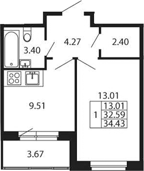 • Площадь кухни9,51 м2