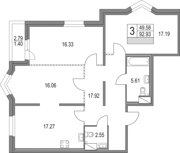 Трёхкомнатная квартира на 8-ом этаже 92,93 кв.м