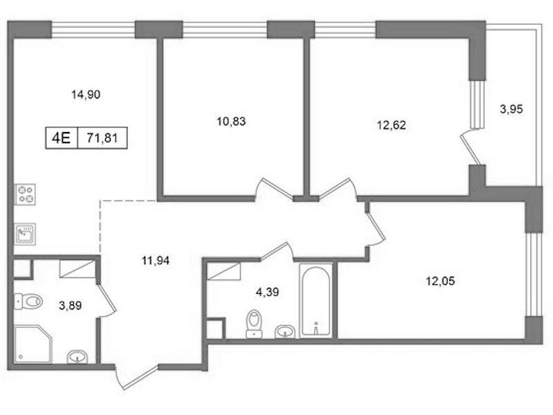 Трёхкомнатная квартира на 4-ом этаже 71,81 кв.м