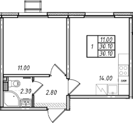 Однокомнатная квартира на 13-ом этаже 30,1 кв.м
