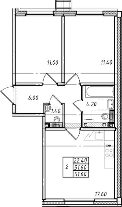 Двухкомнатная квартира на 1-ом этаже 51,6 кв.м