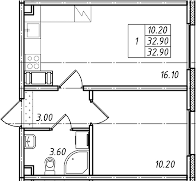 Однокомнатная квартира на 5-ом этаже 32,9 кв.м